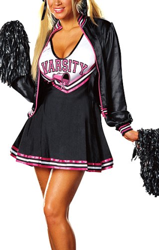 Our Sexy Cheerleader Costume features a stretch knit Varsity dress with front pleated hem, matching Varsity satin jacket, black knit headband (not shown) and pom poms.